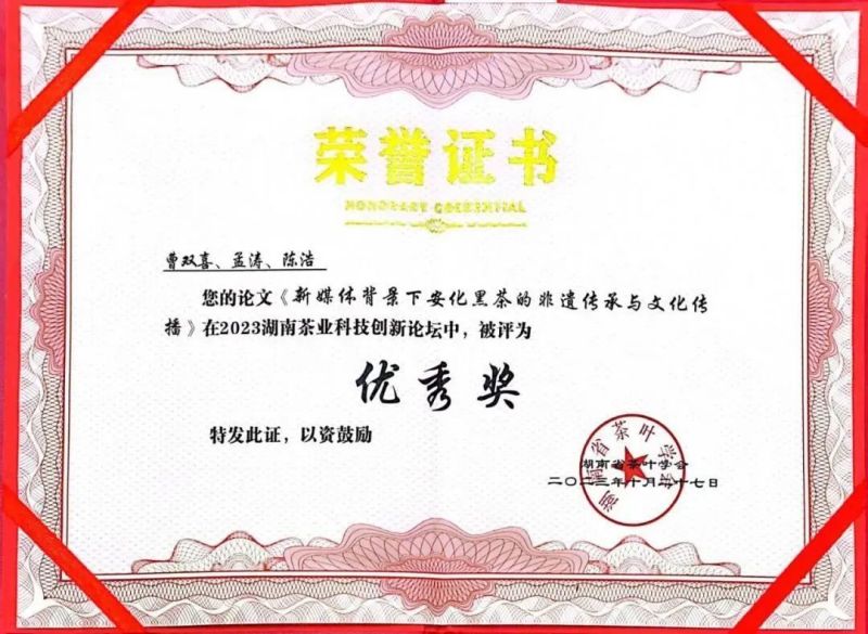 會上,對湖南省茶葉學會2023年度獲獎論文進行了頒獎。白沙溪選送的論文《新媒體背景下安化黑茶的非遺傳承與文化傳播》被評為優(yōu)秀獎。