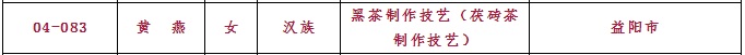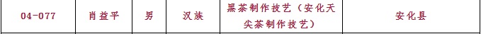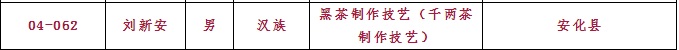 集團共有3人入選傳統技藝類別:分別是白沙溪茶廠總經理劉新安(黑茶制作技藝-千兩茶制作技藝)、常務副總經理肖益平(黑茶制作技藝-安化天尖茶制作技藝)、益陽茶廠質管部經理黃燕(黑茶制作技藝-茯磚茶制作技藝)。