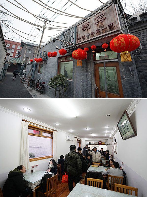 拼版照片:上圖為改革開放后中國的第一家個體飯館——中國美術館正門對面翠花胡同里的悅賓飯店;下圖為顧客在悅賓飯店里就餐(2019年1月29日攝)。新華社記者 鞠煥宗 攝