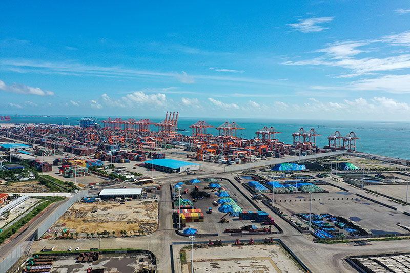 這是2022年8月27日拍攝的位于平陸運河出海口附近的北部灣港欽州港區大欖坪作業區(無人機照片)。新華社記者 曹祎銘 攝